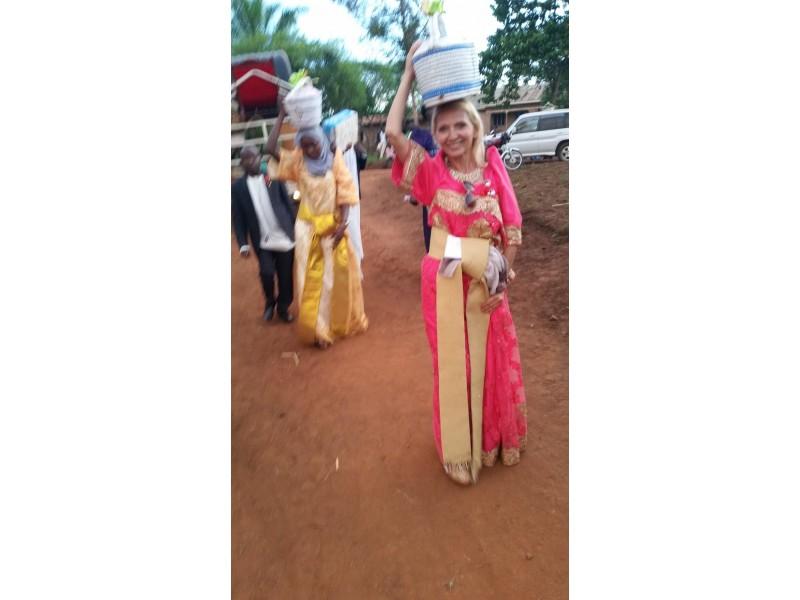 Na kraju je donesen i veliki spremnik za vodu koji ovdje znači puno kada imaš gdje spremiti vodu da ne moraš ići daleko na izvor. Kada je taj dio završen mi smo se povukli a ostali uzvanici su još ostali. Ne znamo koliko dugo. Sve se ovo odvijalo u dvorištu mladenkinih roditelja na zemljanoj podlozi u tipičnom prirodnom ambijentu tog dijela Afrike. Crvena zemlja na sve strane. I nas je izmučila sa prašinom koja se i pored zatvorenih prozora uvlačila u auto prilikom dolaska i povratka, tako da smo preventivno morale staviti masku na lice da zaštitimo dišne puteve. I opet smo dva dana poslije imale bolove u grlu iziritiranom prašinom. Ali isplatilo se jer smo imale priliku prisustvovati jednom tradicionalnom afričkom vjenčanju kakvu nemaju svi u životu. Nama zaljubljenicima u sve što je povezano sa ovim krajem svijeta to je bila posebna čast, a i domaćini su nas tako tretirali. Završavamo ovaj dio naše priče rečenicom koju često koristimo. Teško je opisati to što tamo vidimo, jer se to mora doživjeti da bi se moglo osjetiti srž te ljepote. Bez mirisa, bes vibracije, bez ritma, bubnjeva i plesača teško je to osjetiti. Mi smo zahvalni što to jesmo i preporučamo svakome tko osjeća poziv i ljubav prema Africi da si to priušti ako ikako može. A ako pak ne može, nadamo se da smo vam bar malo rasvijetlili sliku i vidike. Puse i veliki pozdravi od Dragice i Jasminke iz Ugande.