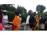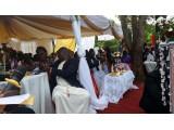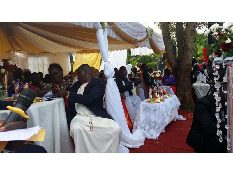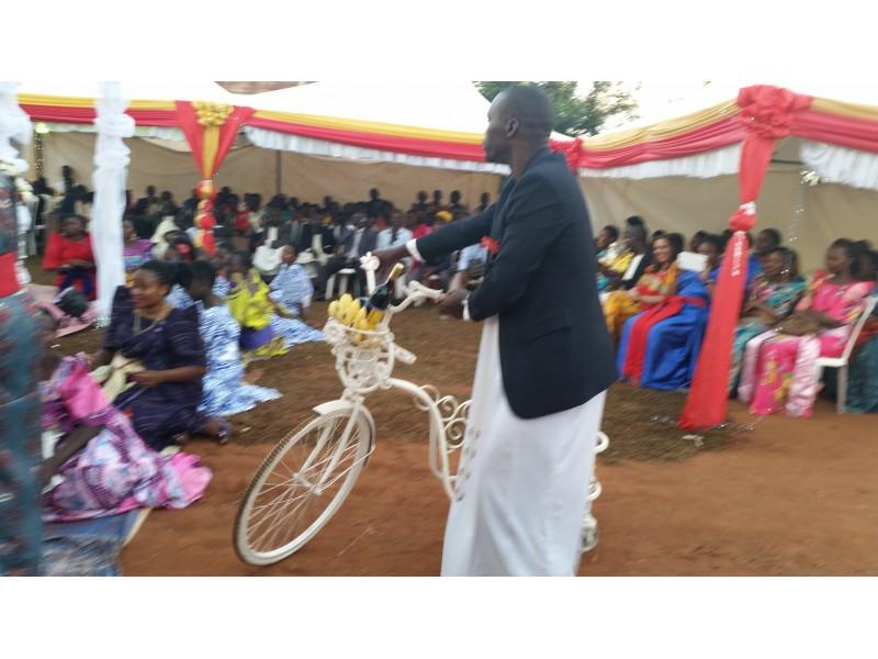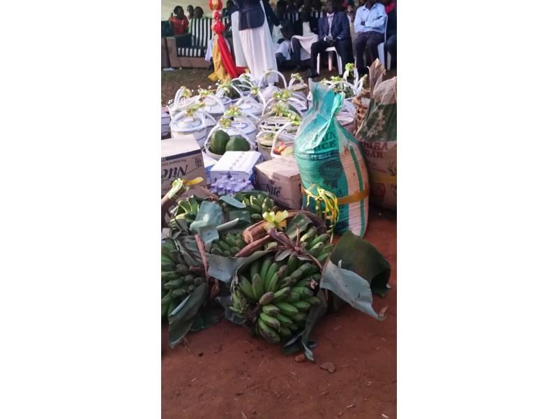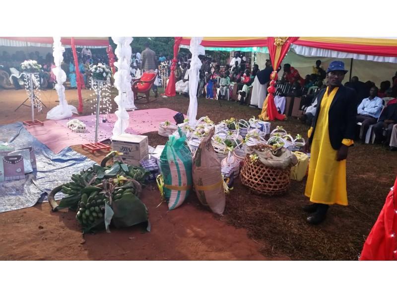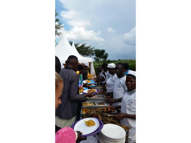 Moramo naglasiti da je sve u duhu podizanja vedre atmosfere i pozitivne energije. Na žalost nismo razumjeli što se točno govori, ali nekako nam to nije smetalo, jer je smijeh uzvanika na svako pitanje i odgovor druge strane bio tako zarazan i nekako je i nas ponio. Smijali smo se i slušali sa zanimanjem baš kao da sve razumijemo. Jako je važno napomenuti kako je hrana poslužena odmah na početku kako gosti ne bi bili iscrpljeni protokolom. Nije ni potrebno naglasiti kako je sva hrana zdrava s puno povrća domaće proizvodnje. Na tanjuru se nalazilo svega, od pečene tikve, matoke (to je zelena banana koja se priprema na sve načine kao i naš krumpir i sličnog je okusa, a često je na stolu Afrikanaca), kuhane kasave (korijenasta biljka koja ima stabljiku kao naš kukuruz ali se koristi u prehrani samo korijen. Može se jesti sirov i vrlo je ukusan, a u kuhanom obliku je neutralnog okusa i vrlo je dobar kao prilog uz kuhano povrće i sosove), dvije vrste riže smeđa i bijela, grašak, mahune i naravno obavezni lubenica i ananas. Za ljubitelje mesa bila je govedina na saft. Nešto slično kao naš gulaš. Uglavnom jedu govedinu. Meso baš i nije preporučljivo jesti, bar ne za nas Europljane, jer se prodaje na otvorenom izvješeno na policama uz cestu. Naš probavni sustav nije prilagođen za tako pohranjeno i od bakterija nezaštićeno meso. Svi su jeli umjereno. Piju se sokovi, svih vrsta. Bilo je Mirinde, ali i nacionalni, poznati gazirani napitak od đumbira pod nazivom Stony. Nije bilo vidno ponuđenog alkohola iako je ovo bila kršćanska svadba. Možda jesu pili ali nismo vidjeli. Ceremnija je trajala nekoliko sati prije izlaska mladenke. U međuvremenu su se smjenjivali plesači njihovih egzotičnih plesova uz bubnjeve i vrlo ritmičnu afričku popularnu glazbu. Između pojedinih nastupa plesača, koje su gosti nagrađivali novcem, na središnji plato izlazile su grupe uzvanika, predstavnici određenih obitelji koje su u srodstvu sa mladencima. Kada izađu gosti mladenke onda ih odabrani predstavnici iz reda gostiju mladoženje daruju nekim sitnicama. Muškarcima se poklanjaju remeni, neke koverte, vjerovatno sa simboličnim novčanicama. Djeci igračke, a žene dobiju kišobrane i tako nešto slično. I mi smo darivali jednu grupu iz mladenkine obitelji.
